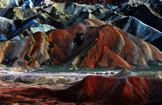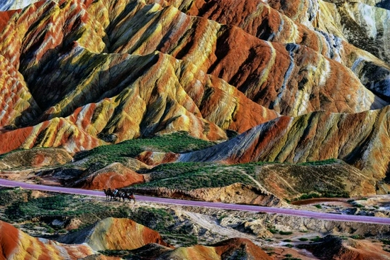 张掖七彩丹霞被《中国国家地理》杂志评为‘中国最美的七大丹霞地貌之一’,色如渥丹,灿若明霞,岩层陡峭,色泽明晰,条条色带覆盖在连绵的山丘,面积巨大,呈现出惊人的气势。随着一天之中天气的变化,地表会变化出不同令人炫目的色彩。