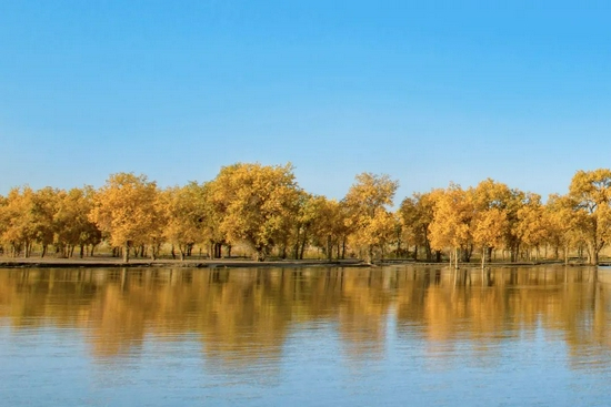 弱水河清澈纯净,波光粼粼的水面倒映着金色的胡杨,河水、胡杨、沙漠,有柔媚、有硬朗、有浩渺,展现着不同的风姿,有种胜似仙境之感~
