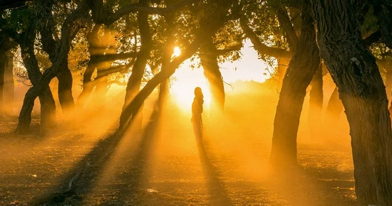 夕阳西下,消失在地平线上的一抹光晕,映衬着神态万般的胡杨,只有身临其境,才能感受到那种生命的震撼!