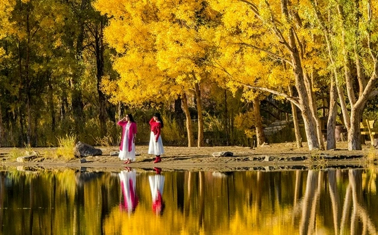 这里的胡杨林树荫遮天,树龄不长,游人也相对来说较少,林中藏着个不大不小的金波湖,金色的胡杨倒映在湖面上,极富情趣,加上远处也有起伏的沙漠和椰枣林,绝对是美美凹造型的好地方。