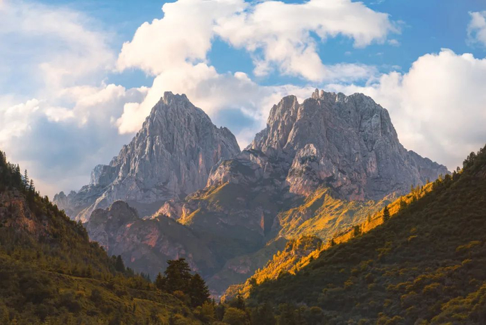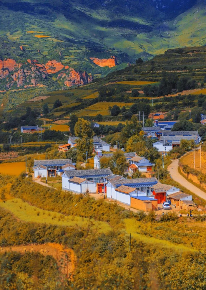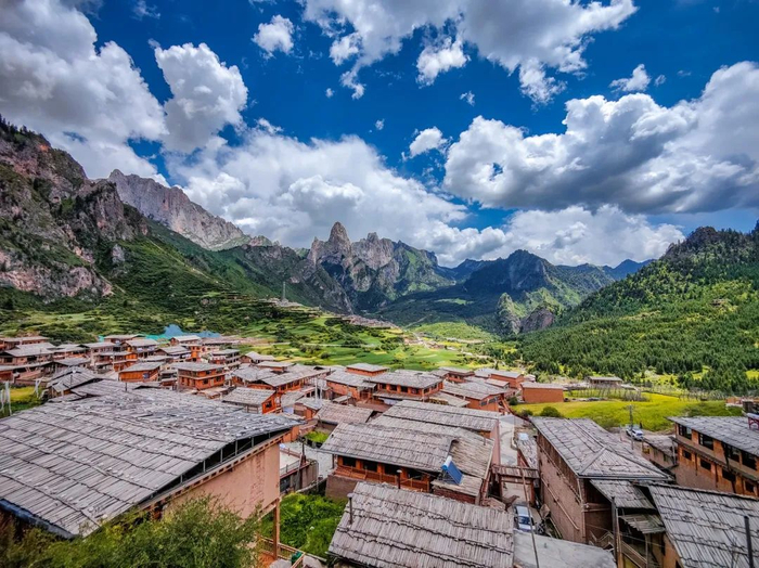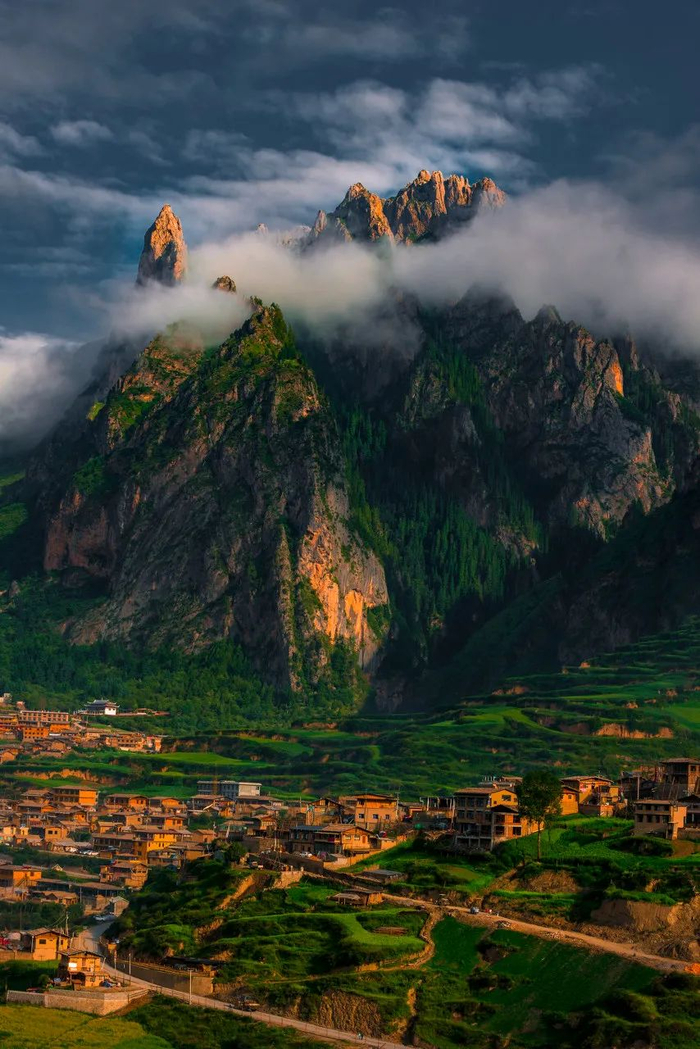 绵延起伏的巨石山峦遍布着五彩的丛林,青稞和小麦交叠成层层错落的梯田,当夕阳西下,旖旎的霞光辉映着壮丽的石城,就像人神共居的宫殿。