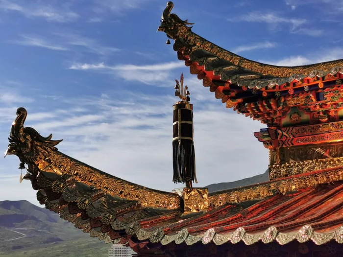 爬上晒佛台旁边的小山坡,俯瞰艳阳下熠熠生辉的金顶,掩映在一片绵延起伏的黄草漫漫中,信仰无声而庄重。