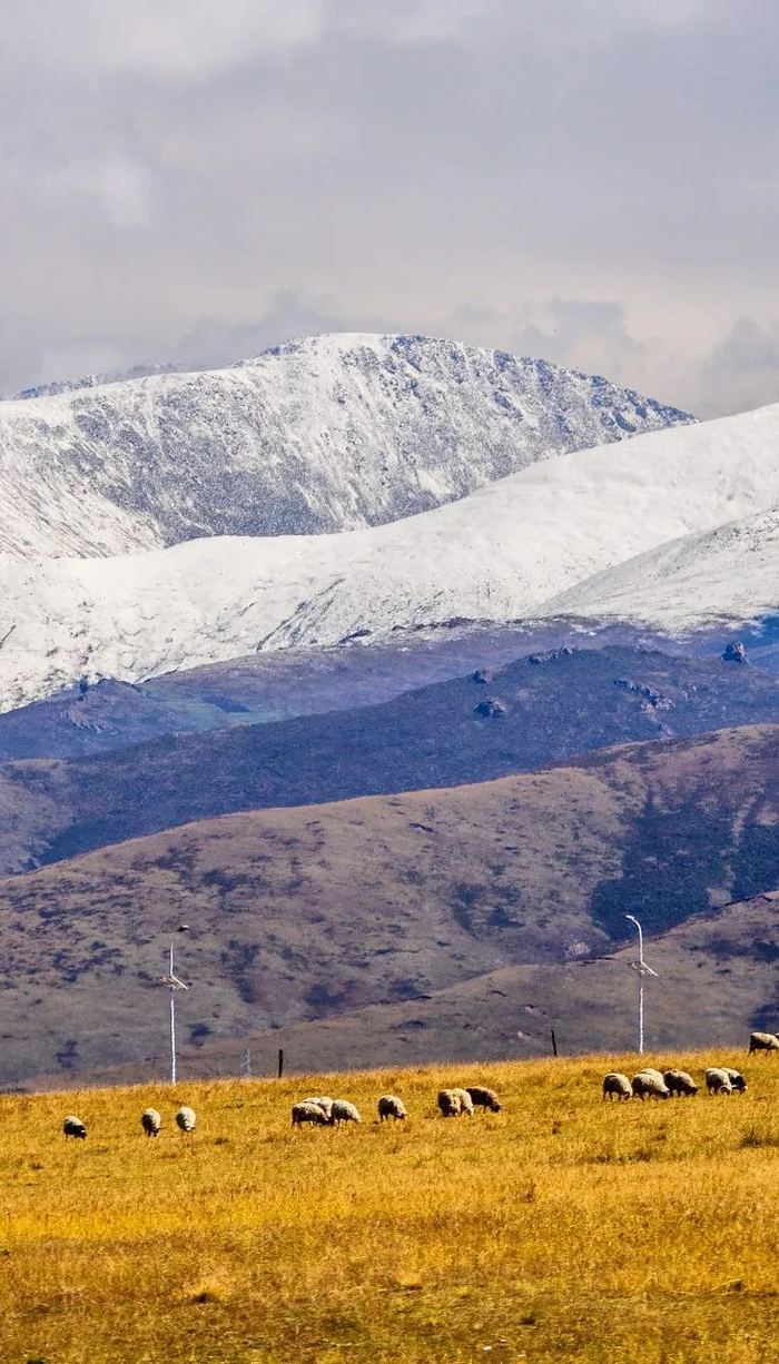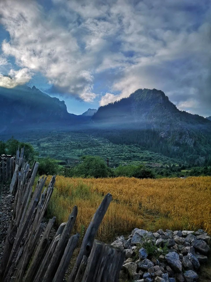 雪山亘古神秘圣洁,五彩的丛林遍布峡谷和山坡,金黄的麦浪随风翻滚。