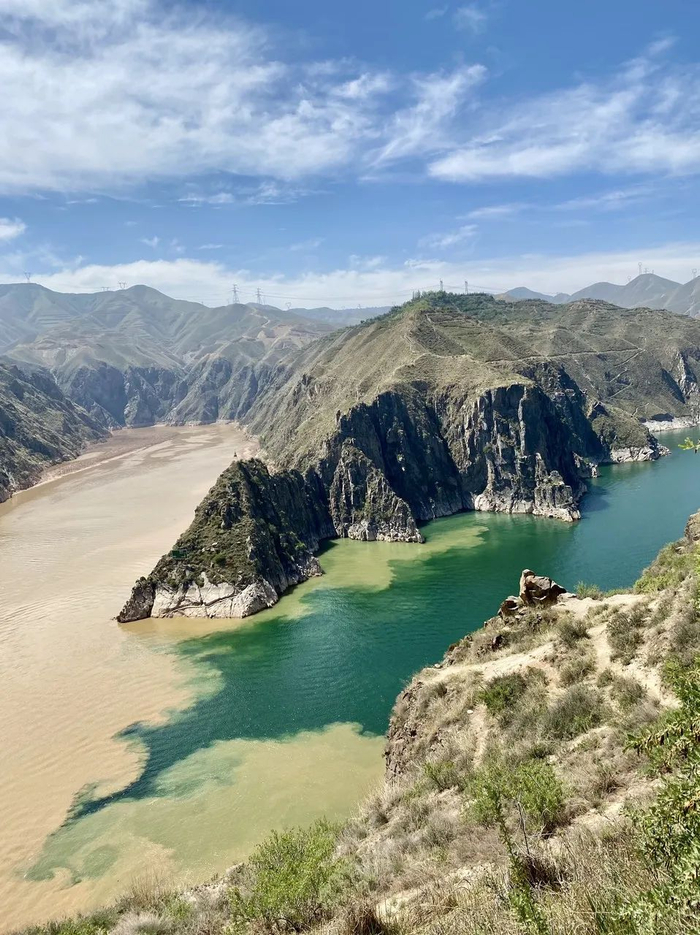 还要站在观景台,以上帝视角,全景俯瞰“一半黄,一半清”的河水,看泥黄的河水如一笔浓重的颜料,缓缓渗入原本清碧的黄河水中。