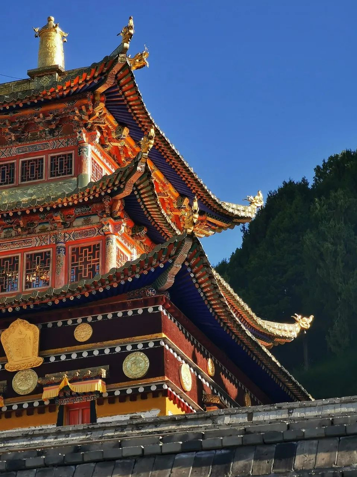 这里天黑的很晚,黄昏温柔且漫长。当你游走在镇内,与一片片金顶、一座座佛塔相遇,缱绻云霞裹杂着一缕缕炊烟,像是回到了故乡般温暖安心。