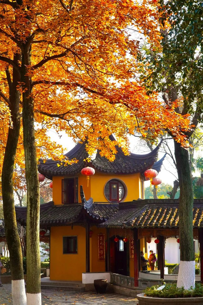 散落满地的叶子,给寒山寺增添了一份古意,江南精美的名刹和这热烈的秋,不正是一幅绝美的画面吗?