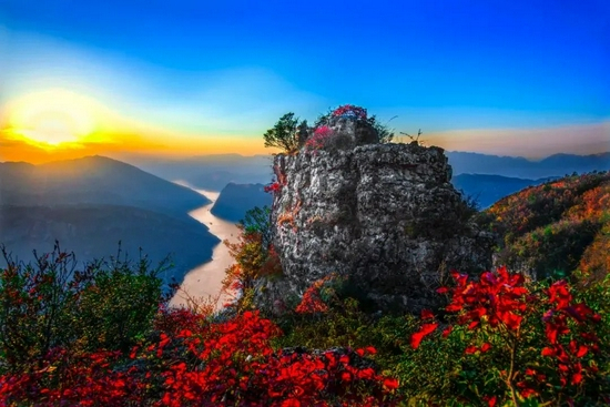 文峰观是进入巫峡的第一山,也是三峡红叶最美之地,将红叶之下的巫山全景尽收眼底。站在文峰观山顶远眺,红叶遍山峦,长江如带、柔润绵长,一江碧水与江山红叶交相辉映,蔚为壮观。