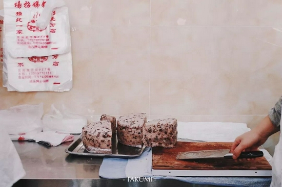 店里的招牌是赤豆猪油糕,像蛋糕似的一个个整齐排列在橱柜里,可以四分之一、八分之一的买,还可以让他帮你切开。