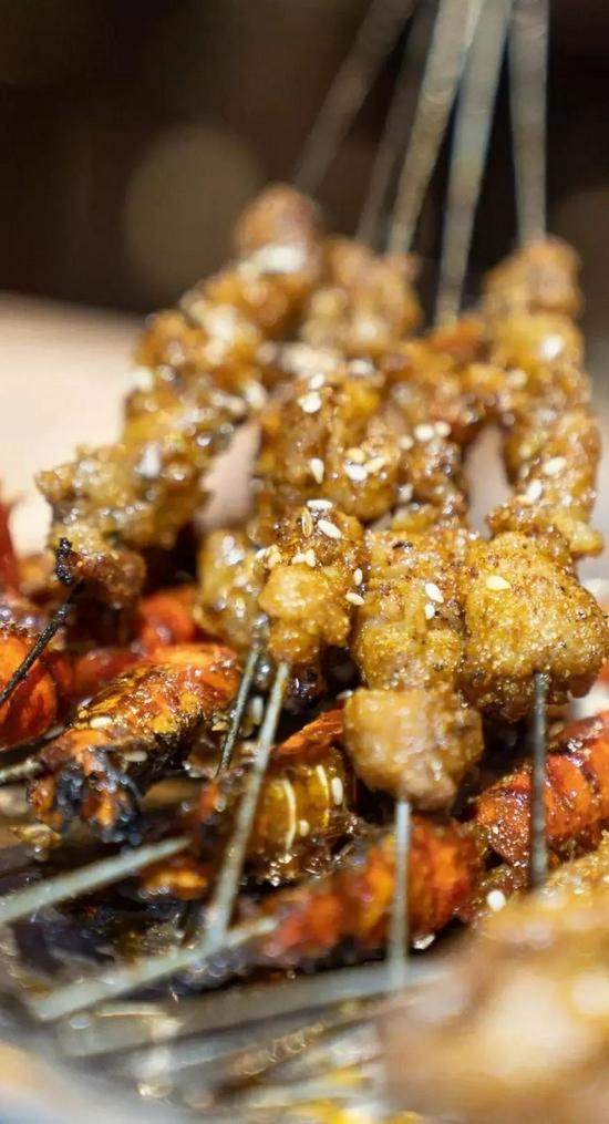除了一些常见的烤物外,还有烤热干面、烤鱼头、烤鸭头、烤凤爪、烤蚕蛹、烤虾球、烤泥鳅、烤粉烤饺子……