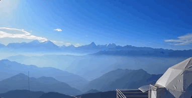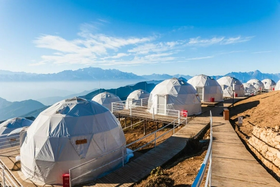 原来的牛背山四周皆为山峦,吃住不便。不过现在除了王牌观景平台以外,景区还入驻了几家精品酒店、星空餐厅。一路雪山陪伴,云海翻斗,熠熠飘散,我们入住营地的大圆球帐篷。