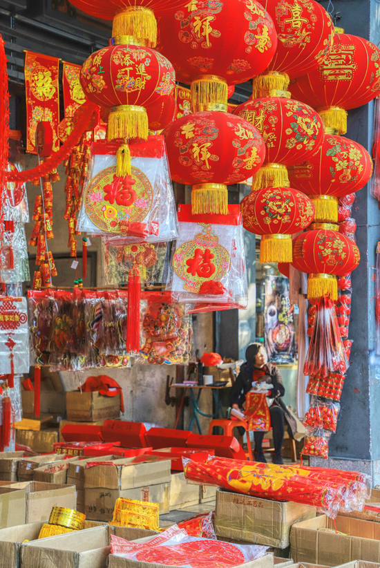红灯笼排排挂在沿街,其他的装饰物则被一箱一箱摆在门口。利是封、中国结、红灯笼、卡通虎像字帖……挑花你的眼。