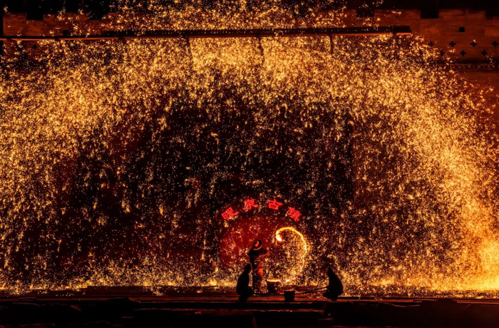 来暖泉镇,必须要看打树花,至今已经有好几百年的历史,用熔化的铁水泼洒到古城墙上,迸溅形成万朵火花,犹如枝繁叶茂的树冠,那壮观程度不亚于燃放烟花。