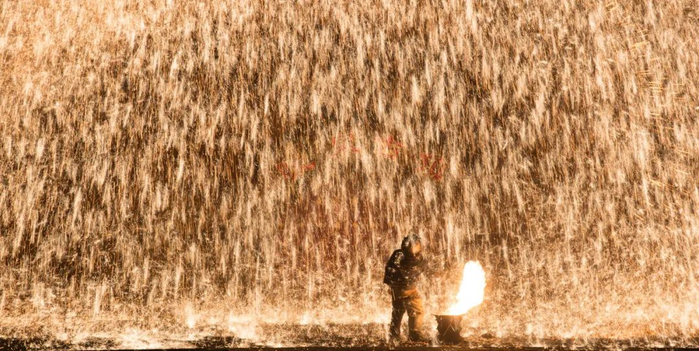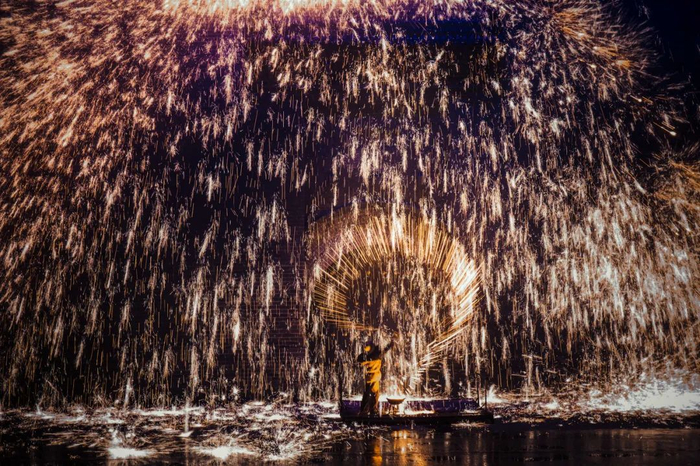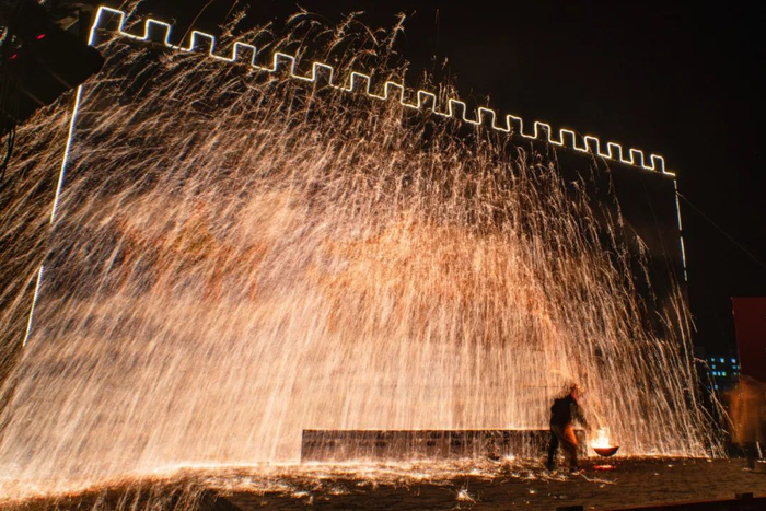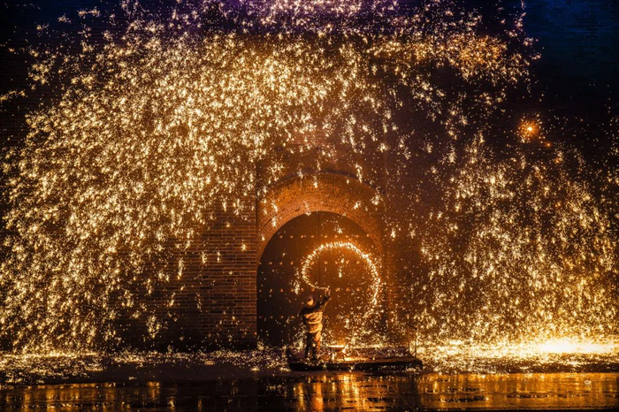 相传打树花是因为当年烟花是富人才买得起,穷人也想放烟花热闹一下,于是就从打铁时四溅的火花中得到灵感,把熔化的铁水,泼洒到古堡城门上方的砖墙上,没想到效果比烟花还好。