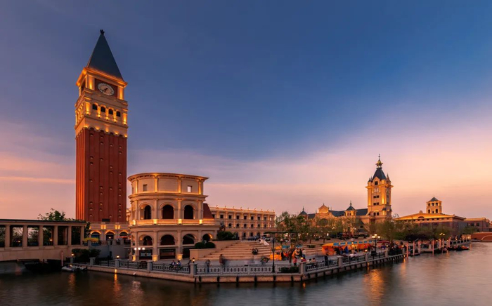 两岸欧式建筑和清澈的人工河交映辉映,有船只划过便模糊了水面中的倒影。