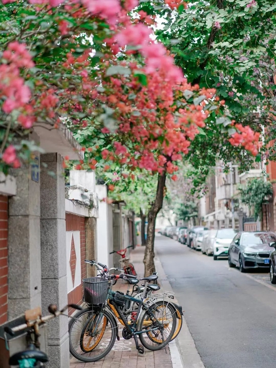 三角梅“越墙”而出,一抹抹粉红让原本平平无奇的街道变得格外有风采。自行车停靠,有一种台式浪漫在其中。