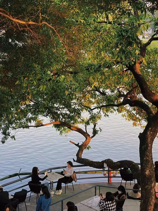 公园的大树下,不分年龄不分职业,有拍照的年轻姑娘也有人字拖大叔。旁边还有新开的美术馆,一楼咖啡厅也是不错的蜗居点。