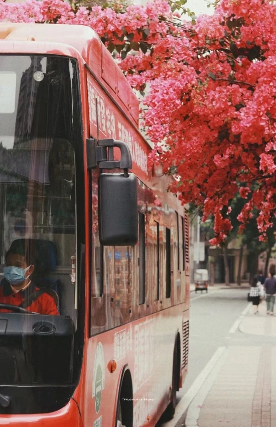 与花色相呼应的公交拂花而过,抓住这一瞬间定格下画面,旅途也变得浪漫起来。
