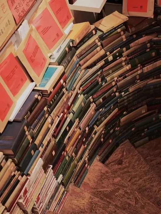 通向二楼的楼梯放满了书籍,满墙满壁的旧书和新书混杂在一起,新旧交替时光掠影在眼前交织。