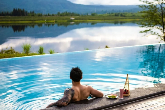 超大的公区内拥有绝美的森林湖泊,晴日的无边泳池像极了“天空之镜”,可以享受森林泡池,部分房型还可泡私汤。