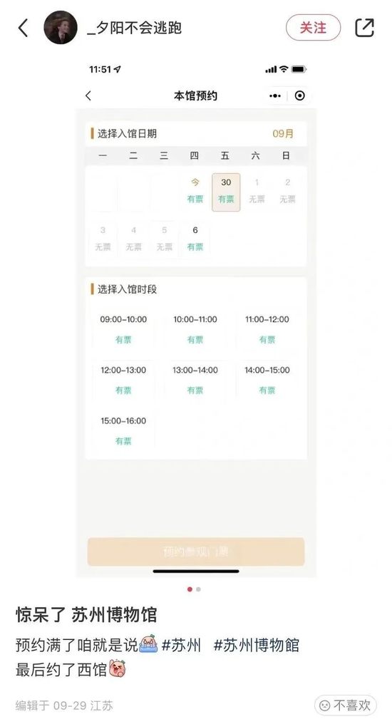 “10月3号,苏州博物馆本馆国庆7天假期的门票均已售罄,一直到10月8日才有可购门票。苏州博物馆西馆(含探索体验馆)则连10月9日均已约满。”(本段来源澎湃新闻)