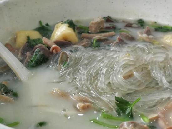 老鸭卤水熬汤,高汤煲起一块块顺滑鸭血,一把细滑的粉丝垫底。再放鸭肠、鸭心、鸭肝、鸭肫,撒小葱香菜。