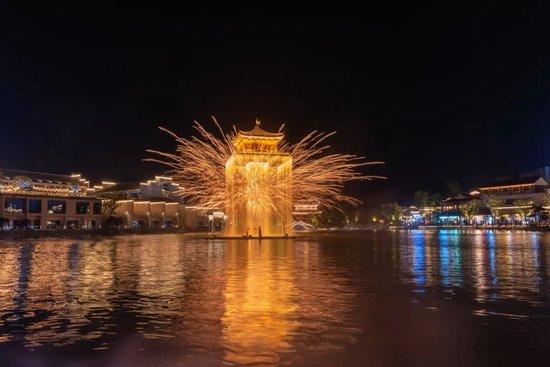 夜幕中的婺女洲,如梦如幻 在金色飞檐上,绽放着绚丽流光,乘船观赏,璀璨烟花绽放,仿佛穿越盛世大唐一般!