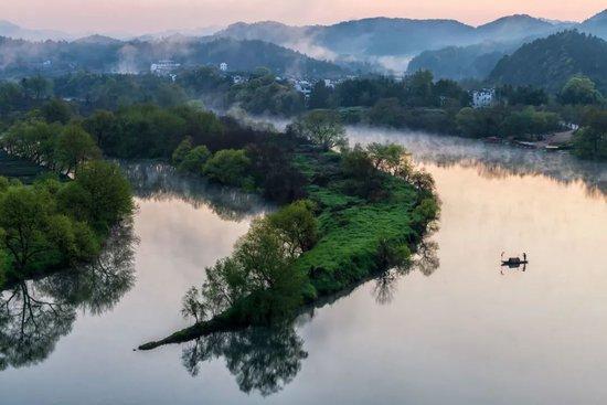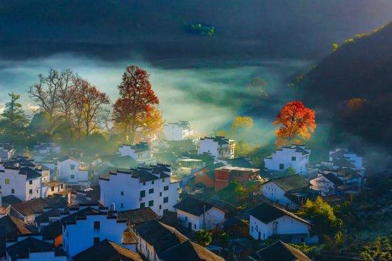 笼罩在晨雾中的山峦跌宕起伏,山下黛瓦白墙组成的古村落在袅袅炊烟中呈现,十分美好。