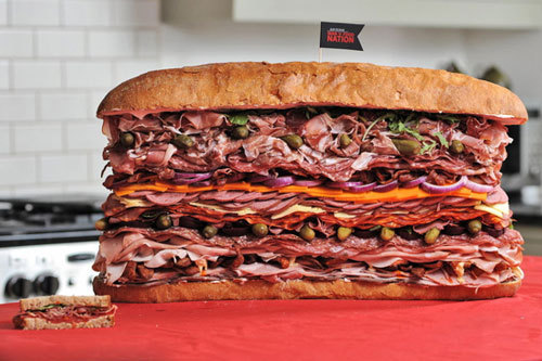 15英尺高,24英尺宽,重逾12.7公斤三明治含1445克面包,2千克意大利腊肠、火鸡肉和熏猪肉,1千克香肠,720克西班牙香肠,再点缀以沙拉酱,奶酪和小黄瓜。
