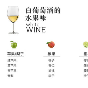 对葡萄酒的香气进行描述时,一般先从它的水果味入手。白葡萄酒的四大果味特征包括苹果/梨子、核果、柑橘和热带水果;红葡萄酒的四大果味特征包括黑色水果、红色水果、蓝色水果以及其他水果。与果味相对的是“非果味”,红、白葡萄酒中的非果味包括花朵、香料、药草及其他的味道。下面三个表格分别展示了白葡萄酒的水果味、红葡萄酒的水果味以及红、白葡萄酒的非水果味。