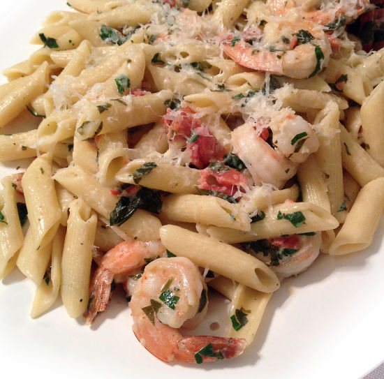 制作食材:1磅意大利通心粉;1/4杯橄榄油;1磅个头中等的虾,去皮;4颗蒜瓣,切碎;1/2茶匙粗盐,调味的时候可以多放点盐;1/2茶匙新鲜的黑胡椒粉,调味的时候可以多放点;1罐子(15盎司)番茄,切块去水的;1/2杯碾碎的新鲜罗勒叶;1/2杯碾碎的新鲜巴西利;1/4茶匙碾碎的红辣椒末;1杯红白葡萄酒;1/3杯蛤蜊汁;3/4杯鲜奶油;1/2杯柏马臣芝士。