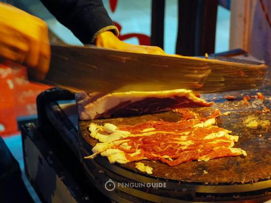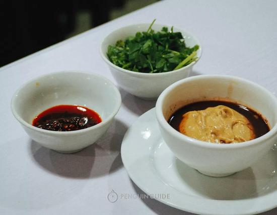 和北京老店一样,二八酱里要用韭菜花、蚝油和腐乳拼出一张笑脸,然后撒上一撮白芝麻。不光看着喜庆,各味比例也能拿捏准确,这一碟蘸料是我们在上海吃下来最香的,稠度也完美。