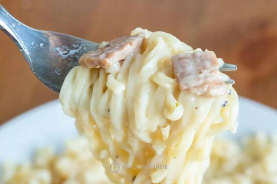 直到我加入了那包魔法料理,浓郁奶香混着培根粒倾倒而出,裹住面条的那一刻,它瞬间变身了!搅拌均匀,用叉子卷起吃的时候,我真的以为自己在吃意大利面……