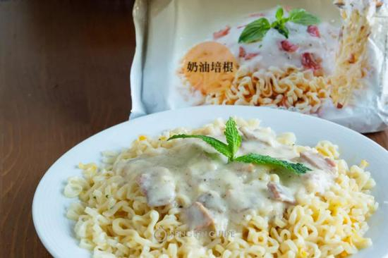 最不可思议的是台酒制作出了一款,奶油培根意大利面口感的泡面,名字很台,叫白酒帕式达,是加了白葡萄酒的Pasta泡面。
