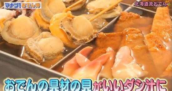 鲣鱼加海带的汤底,北海道的贝类捕获量居全国第一位, 贝类也被大量用作关东煮的食材,使汤熬制的更美味。