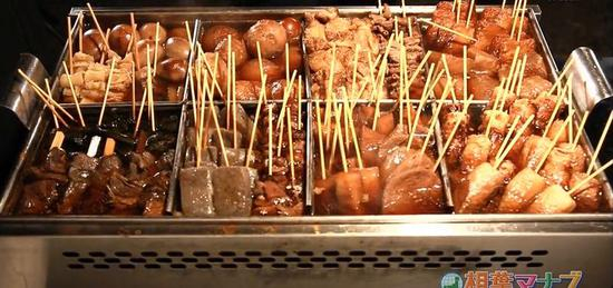 浸煮在黑色酱油汤汁里的成串关东煮,是静冈关东煮的特色,与关东一般用鲣鱼片熬制汤底不同,这是通过不断添加牛筋来熬制的。