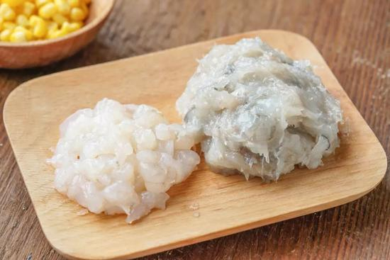 1、150g虾仁洗净去除虾线,取100g虾仁剁成虾泥,剩余50g虾仁切小粒备用。