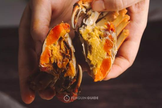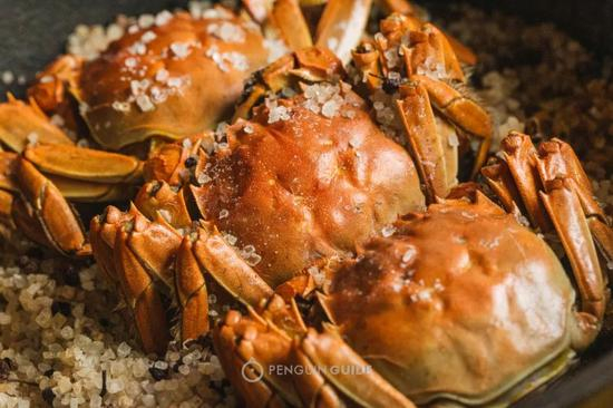 盐焗使大闸蟹的风味更加浓郁,鲜和嫩都被紧紧锁在壳中。蟹黄和蟹肉也都吸收了花椒盐的味道,香气扑鼻。