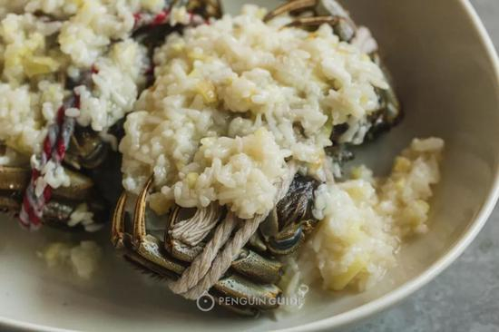 大闸蟹与热腾腾的米饭相逢,蟹黄和蟹膏闪着金光渗入米中,软糯鲜甜,是难以抵挡的凶残!