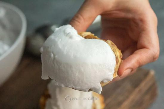 2、取鸡蛋清打发至干性发泡状态(如上图所示,几乎没有流动性),舀一勺蛋清,均匀覆盖在已经装壳的蟹粉上。