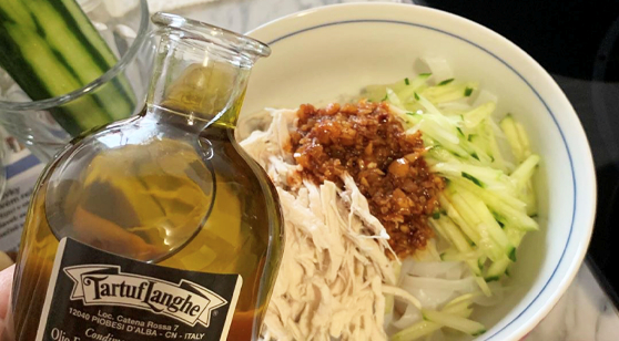 用料:黄瓜,面条,豆芽,花生,葱,鸡胸肉,花椒油,辣椒油,蒜蓉,盐,白糖,鸡粉,香油,酱油,陈醋。