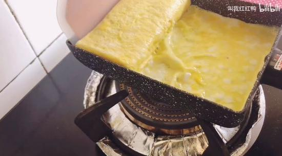 往前推卷好的蛋卷,浇入第二层蛋液,记得将蛋液流入卷好的下面,在半熟的时候卷起来。