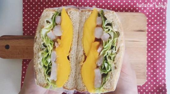 放上生菜,裹上保鲜膜切开,芒果虾仁三明治就做好啦。
