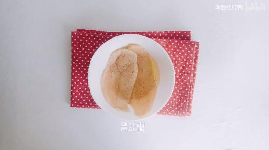鸡胸肉紫薯蛋三明治,在鸡胸肉中加入,橄榄油、盐和黑胡椒,正反面都需要哦,之后腌制10分钟。
