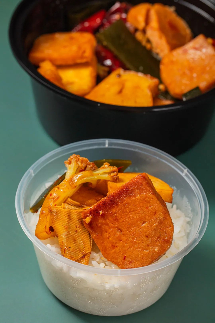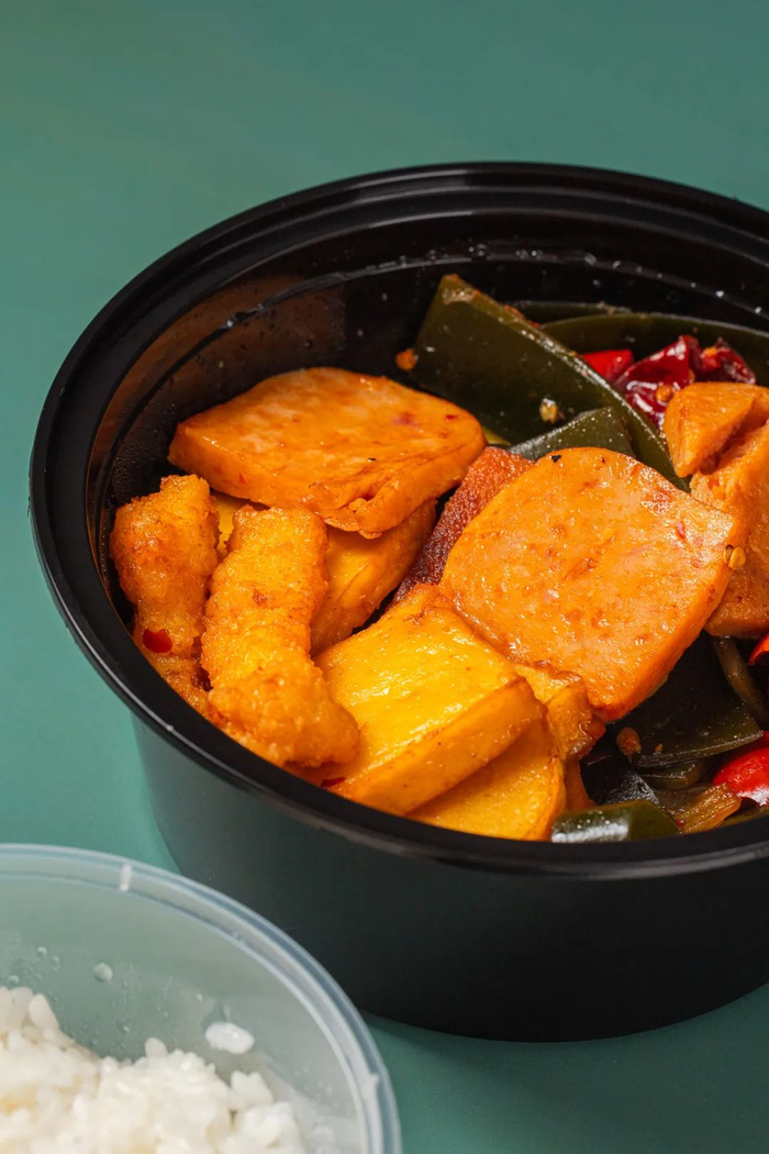虽说是单人套餐,但食材种类还是丰富的:午餐肉、青笋、豆腐、海带、花菜等等等等,一样都没落下。午餐肉套餐当然最关键的是午餐肉,他家用的是梅林牌的,品质保证、特别用心;其他的菜品爽口入味,堪称下饭神器。