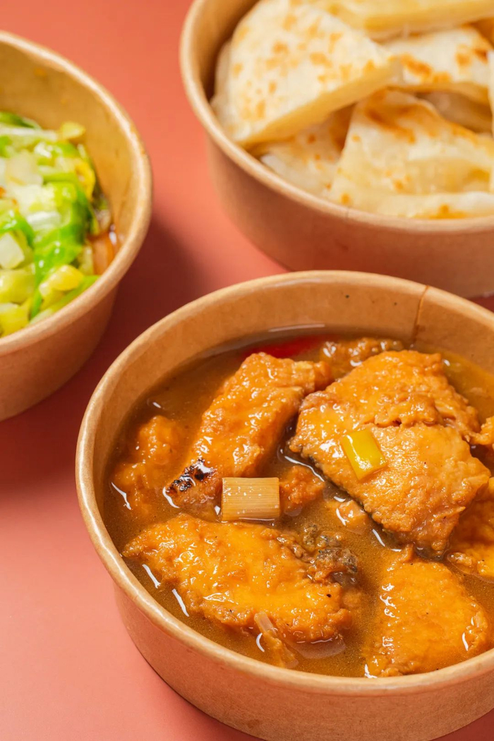所以,周一我就点了他们家的外卖,安心经典红烧大鱼饭,一个人的分量,吃起来刚刚好。送过来的时候,饼子还是热乎的,散发出小麦的香味,是店里的熟悉味道;红烧鱼是重点,大块、刺少、肉多,一扒拉鱼肉就滑下来,而且外表焦脆,好似炸过一样,里面还有一些豆腐,十分入味。