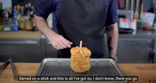 所以等待的期间可以想想,接下来该怎么消耗卡路里,时间到捞出蟹黄堡等待冷却,最后插上小木棍,这才是真正的完美复刻~