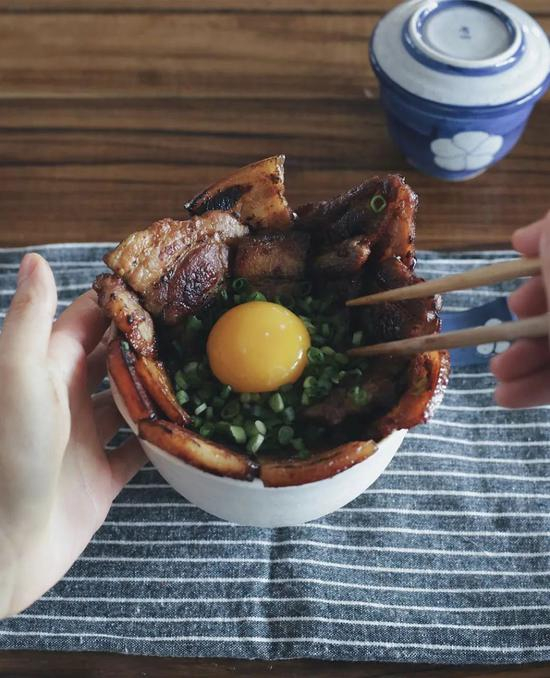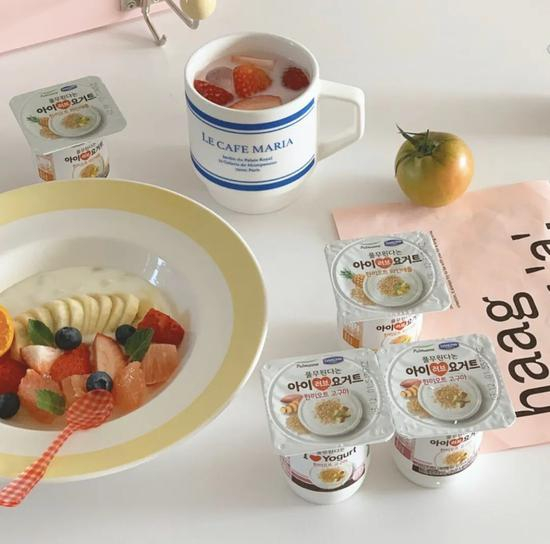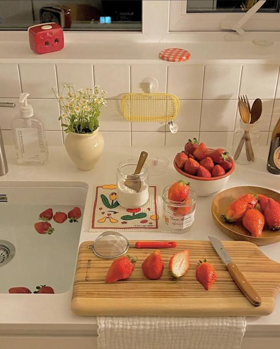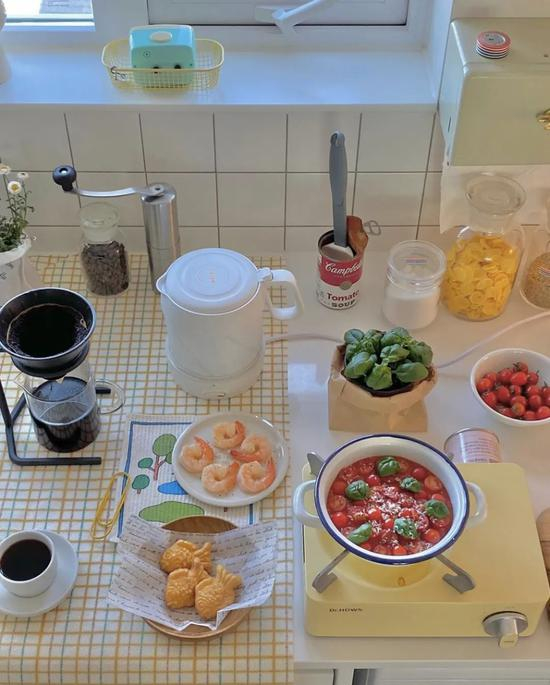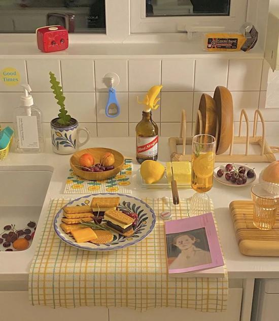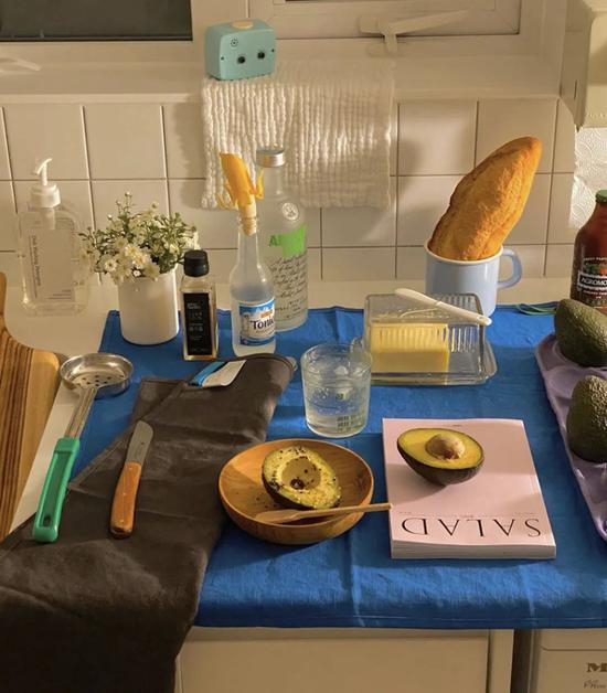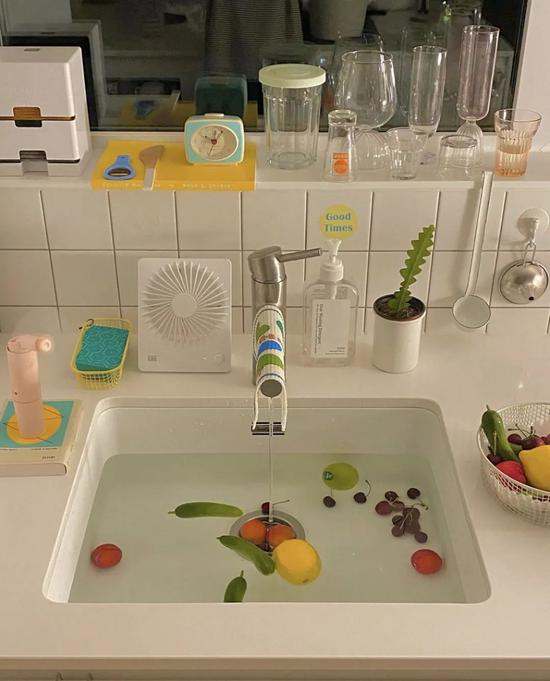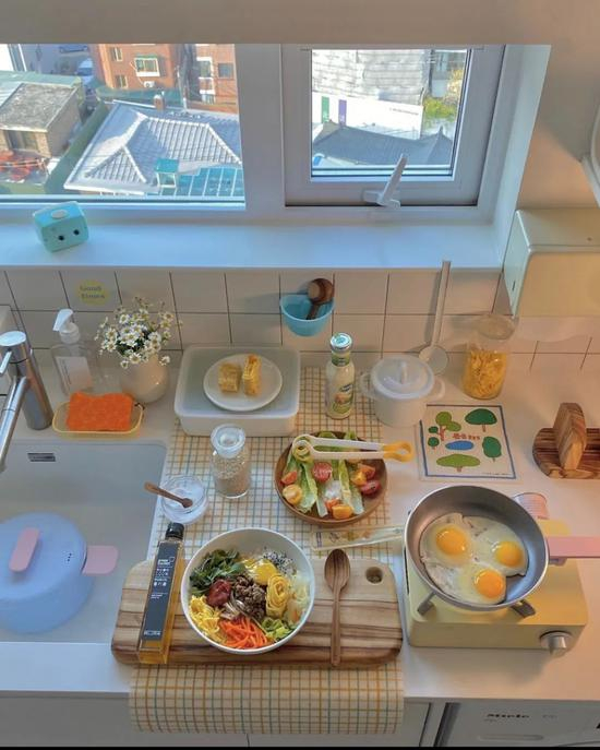 这位IG博主的美食照片随性中带着文艺,洗水果、切水果、做饭、吃饭都在这一小块区域解决了。有没有一种当代租房一族虽然不富,但生活依旧过得精致又文艺的气息?看似桌面上随意堆了很多东西,但却杂而不乱,而且看着还很舒服。