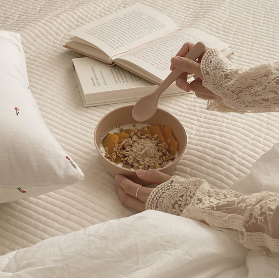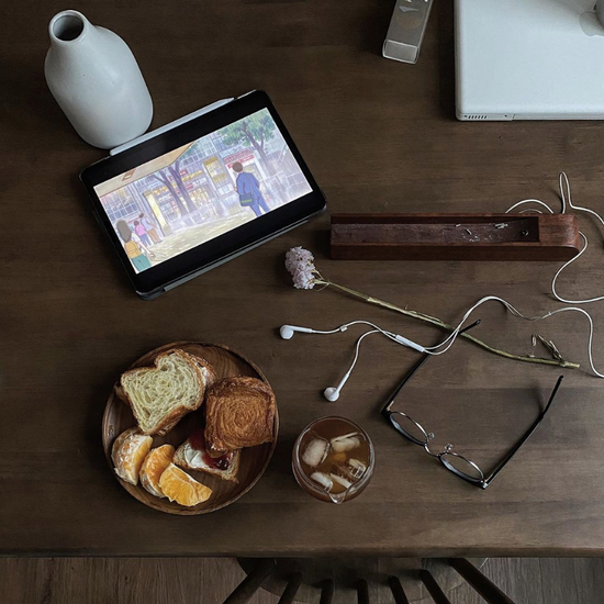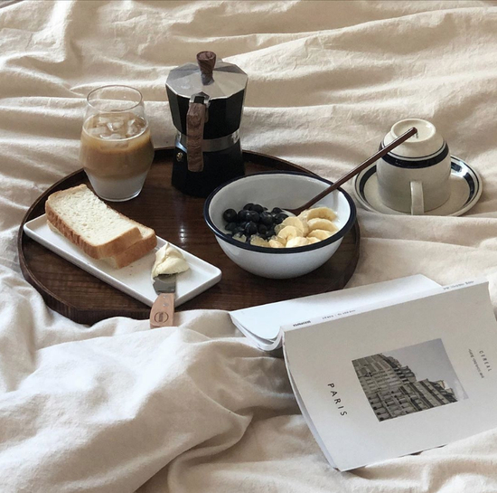 如何才能营造一种文艺的生活气息?试试将美食带入某种生活状态,比如一边看剧、看书或是工作中。那么少不了的摆拍道具就是:艺术类的书籍、笔记本、钢笔、iPad、苹果电脑、耳机、小音响等等,或是直接把餐桌搬到床上~最近很流行在白色床单上拍摄美食照片,记得要用木质或是浅色的托盘哦~