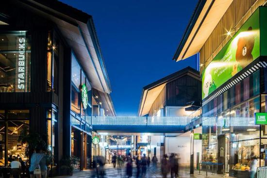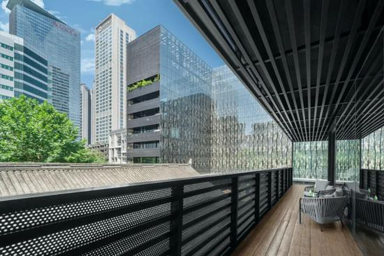走入庭院,像极走进了晚清的大户人家,10米的石板路旁,年长的老树和砖石、屋檐被混搭成为艺术区,优雅的竹林掩映让人想起了附近的青城山,四周环布的立体网状外墙灵感源于四川特色的织锦工艺,呈现着既现代又复古的韵味。