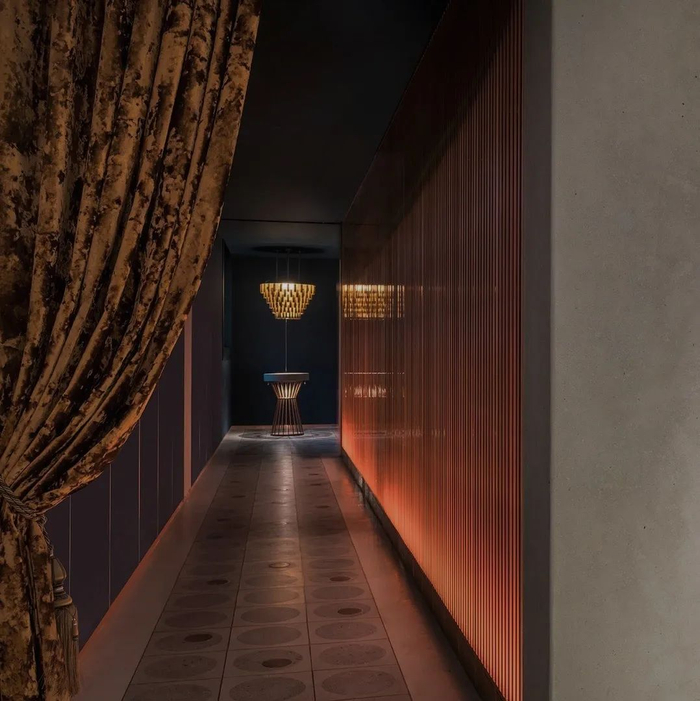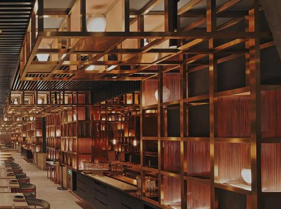 由巴厘岛AMAN的英国设计师 Andy Hall担纲室内设计。整个空间就像是艺术馆一样,被金色镂空的装置包裹。加上灯光的衬托,雍容而绚丽。